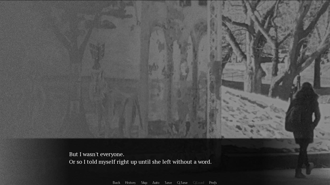 Also Free to Use: You are free to draw whatever inspiration you will from my code, separate from the dialogue and story. If you like how I set up a specific transition, feel free to borrow it for your project (if my work gives you some ideas, credit would of course be welcome). Note however that this is my first Ren’Py project and I limited myself to using basic functionality outlined in Ren’Py’s documentation, so my code will most likely only be useful to people getting started with Ren'Py or people who are interested in seeing how this particular novel works.