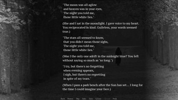 An unnamed narrator finds a vinyl recording of Little White Lies while cleaning his room. He does not remember having ever seen the record and he does not recognize the artist, but he is familiar with Little White Lies. The song reminds him of a woman he cared deeply for in the past but who disappeared. As he recalls the original lyrics in his head, he remembers the time he spent with her, her little white lies, and how she disappeared from his life. Despite being conflicted, he plays the mysterious vinyl, which plays as expected save for a couple changes to the original lyrics. What happens after the record finishes playing is much less expected. The game features several choices and six distinct endings after very short branches, although the endings do not diverge greatly from one another.