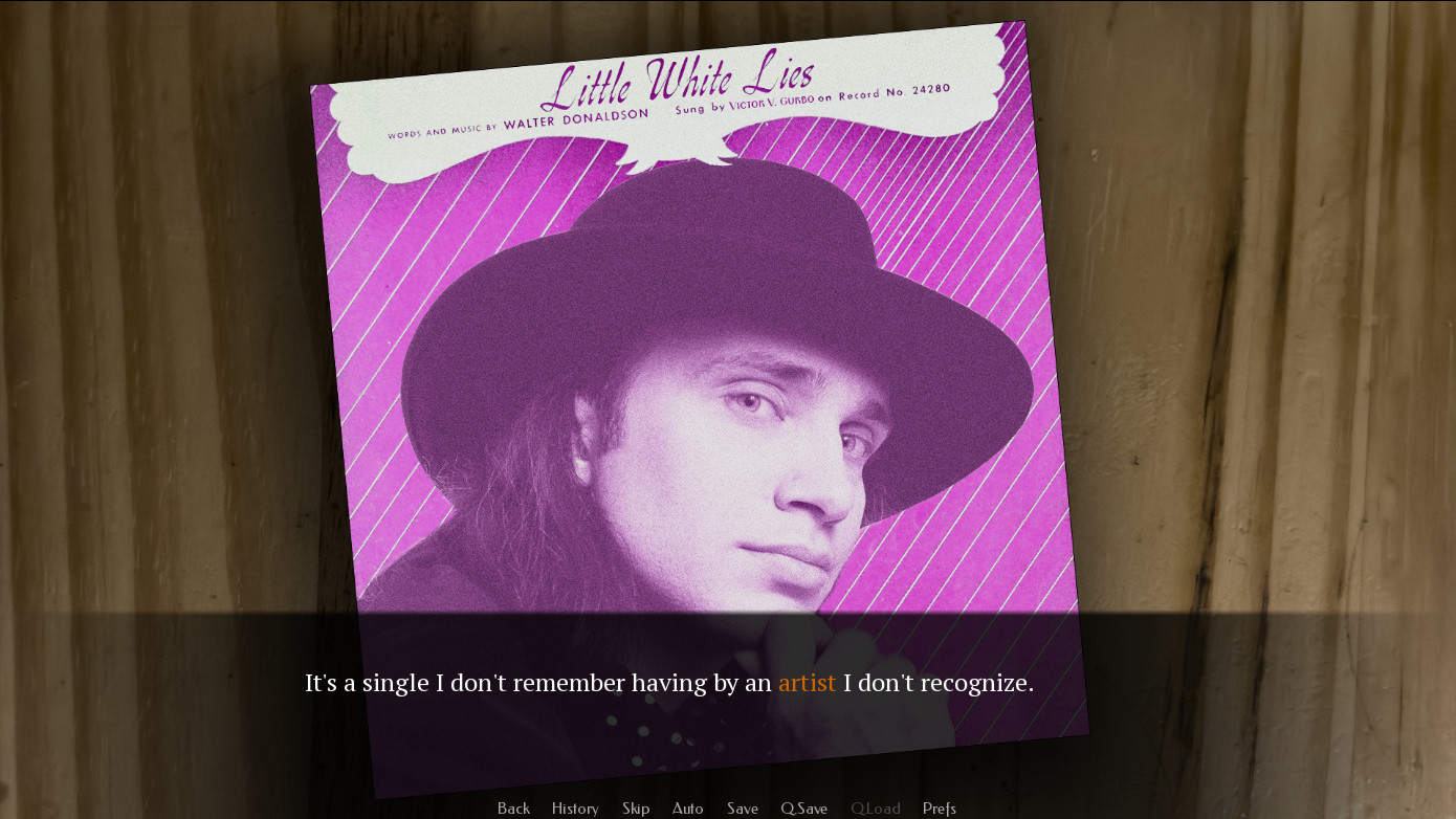 Victor and I decided to work on a visual novel together for the Gaming Like Its 1930 contest. Because Victor is a proverbial music historian, I trusted him to find a good 1930 song entering the public domain to use as the inspiration for our game. He suggested Little White Lies, and I immediately agreed after reading the lyrics.