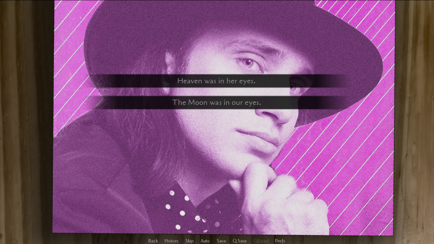I thank everyone behind the development of Ren'Py for creating a free and open source tool and terrific documentation that allowed me to script a presentable visual novel, and do justice to the original Little White Lies lyrics and Victor's new take on the song, in just under two weeks with no prior development experience. I also offer my thanks to the creators behind the three sound effects I pulled from Pixabay, each of which adds something special to our final piece.